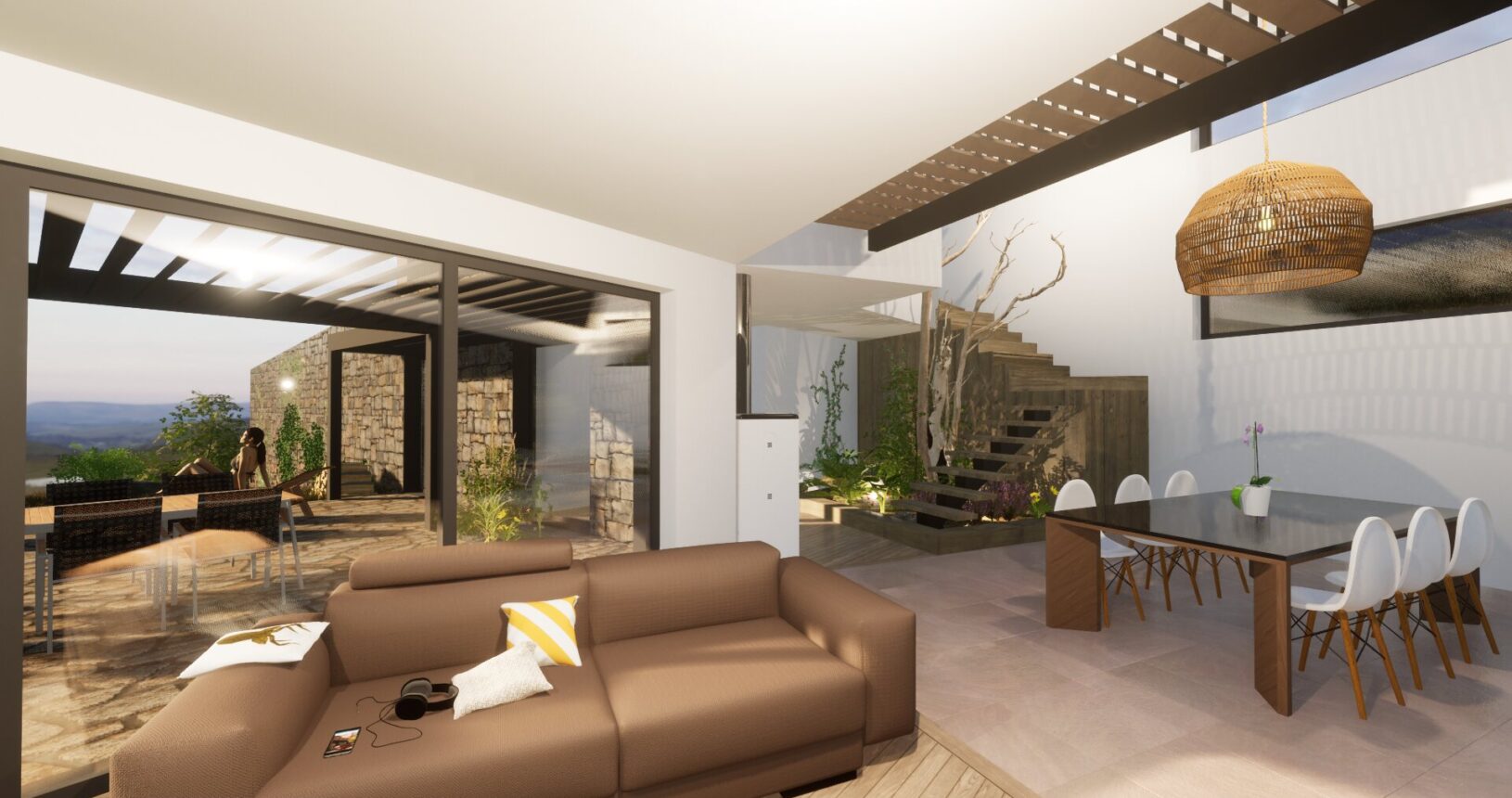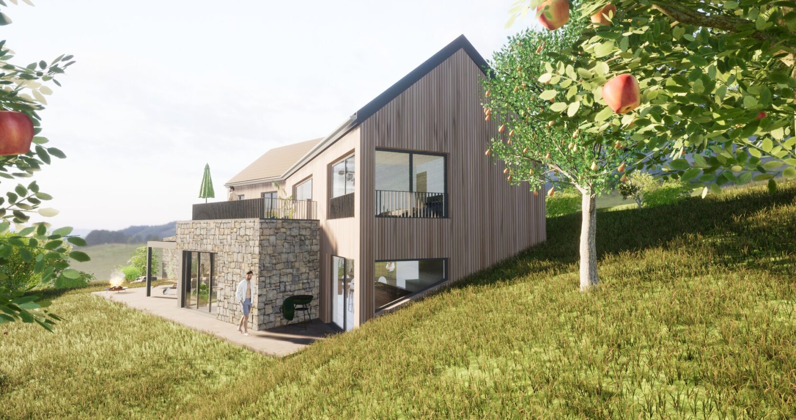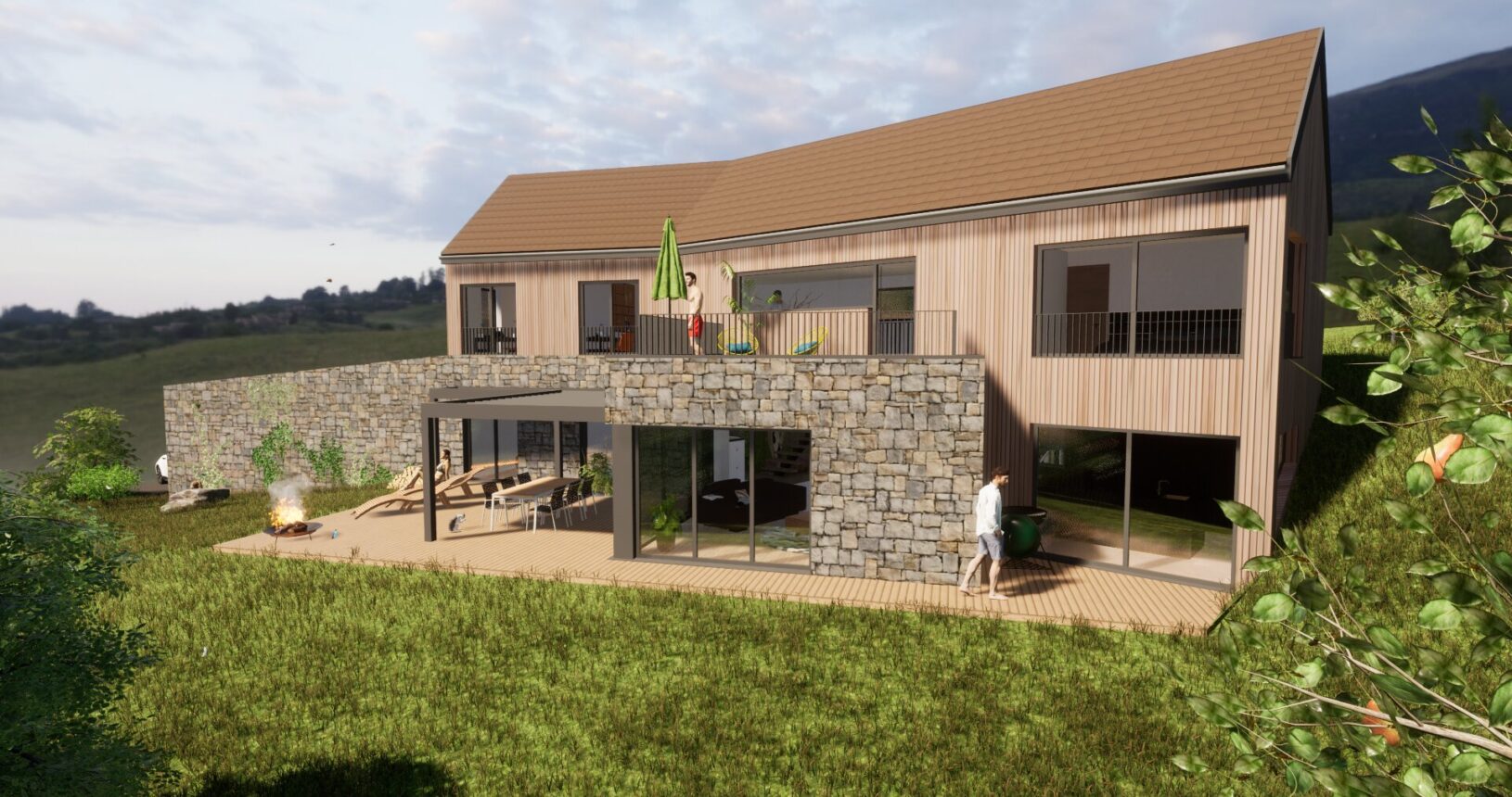 Le terrain, en partie en pente mais présentant une zone partiellement plane surplombe le paysage. Ainsi, le projet est conçu pour s’intégrer au maximum dans son cadre : la maison est implantée sur la partie plane du terrain, en suivant ses lignes qui en outre dessinent un angle lui permettant de s’ouvrir vers le paysage en contrebas.