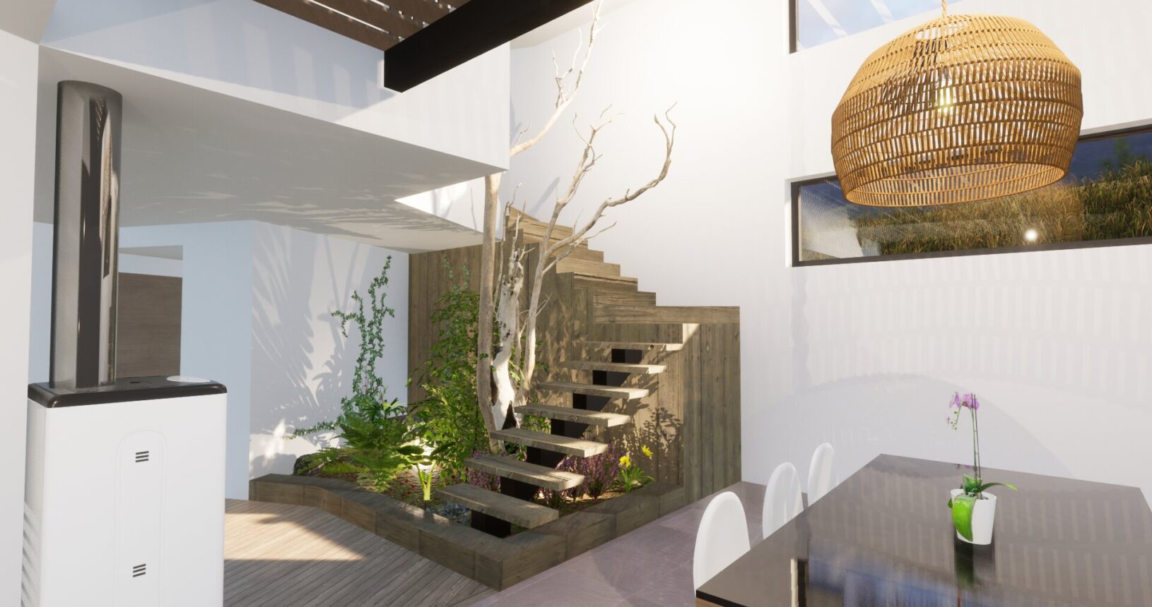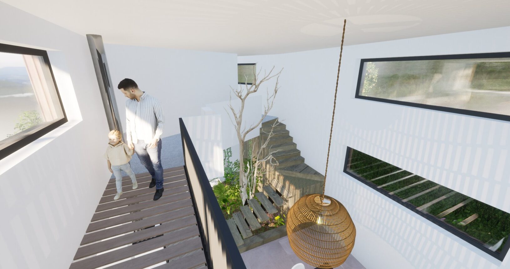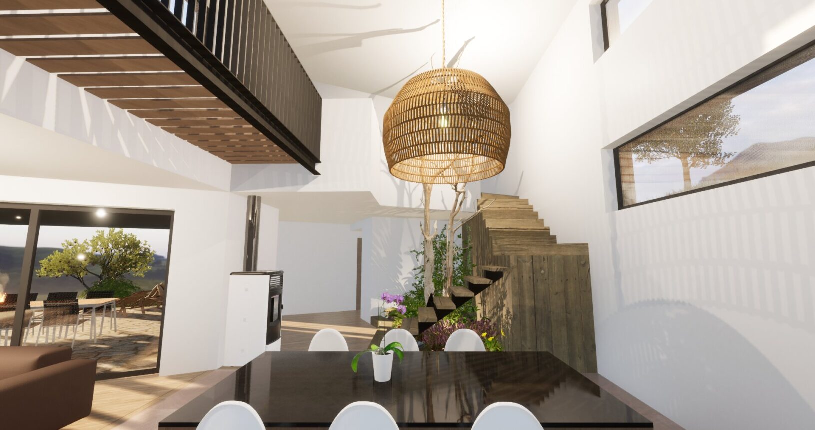 Les espaces de vie, les chambres et la terrasse bénéficient alors d’une orientation privilégiée en dialogue avec le site environnant.