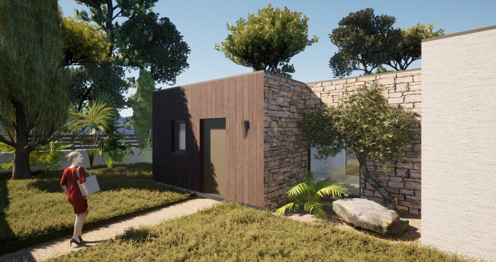 Afin de s’intégrer harmonieusement dans son contexte, les volumes sont de volumétrie simple et traditionnelle, recouverts d’enduit minéral. Certaines parties sont habillées de pierre de pays telles les bergeries traditionnelles Corses. Dans le but d’alléger visuellement les volumes et y apporter une matérialité chaleureuse, certains volumes sont habillés d’un bardage bois.