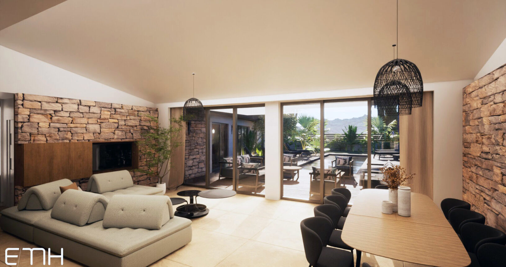 Cet espace de vie est orienté vers la terrasse et la piscine avec lesquels il ne fait qu’un, grâce aux baies vitrées largement dimensionnées sur la totalité de la largeur de la pièce. Ainsi l’espace intérieur se prolonge vers l’extérieur et inversement. L’extérieur est par ailleurs équipé d’une cuisine d’été et d’un espace dîner abrité.