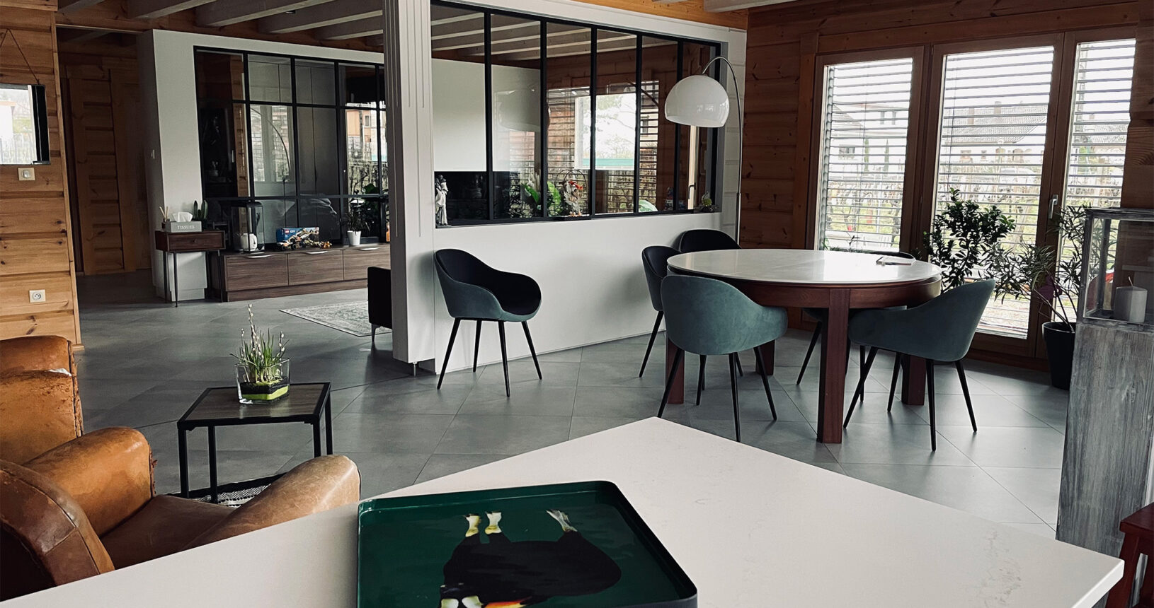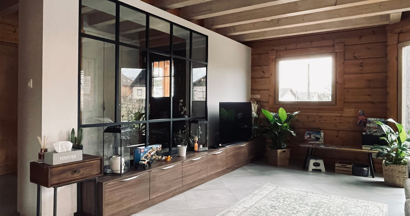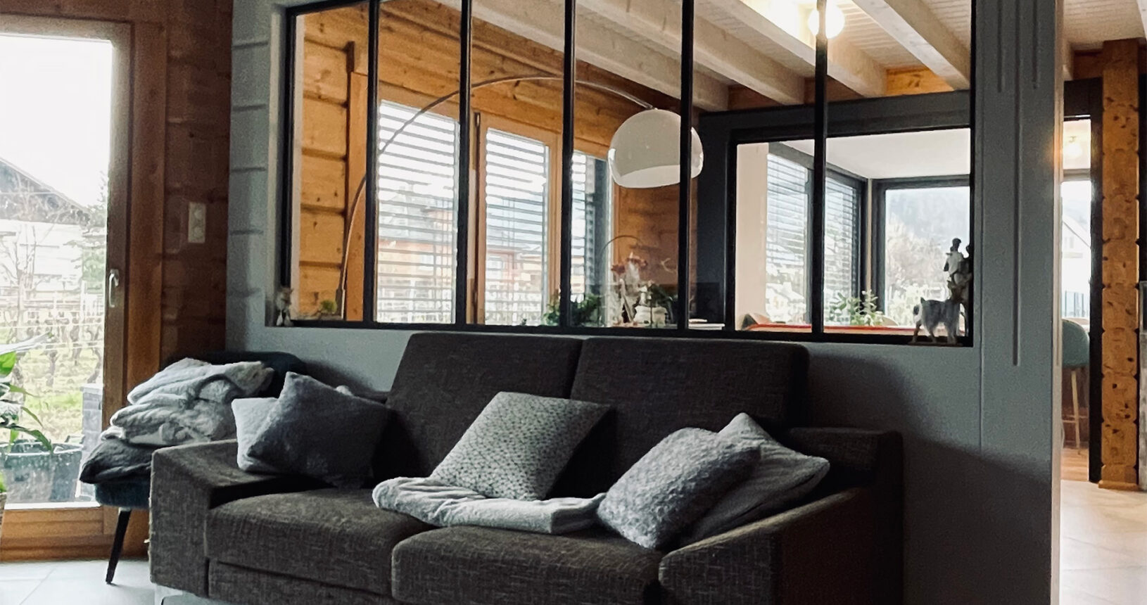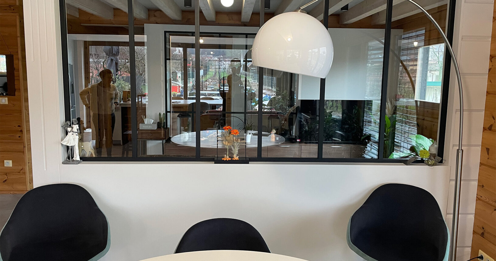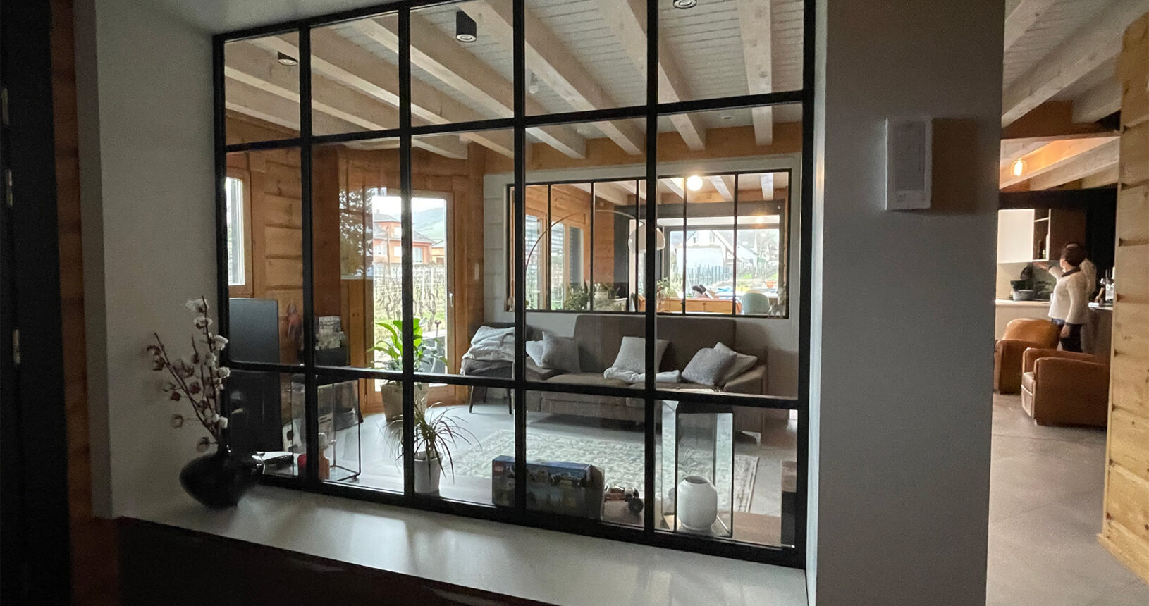 Cet agrandissement fut l’occasion d’ouvrir la quasi-totalité du mur porteur existant pour apporter de la lumière naturelle aux espaces plus en retrait ; par la même occasion certaines cloisons ont été remplacées par des cloisons vitrées de type verrière industrielle.
