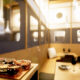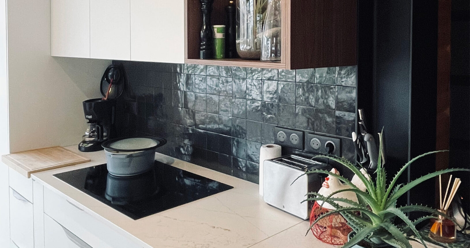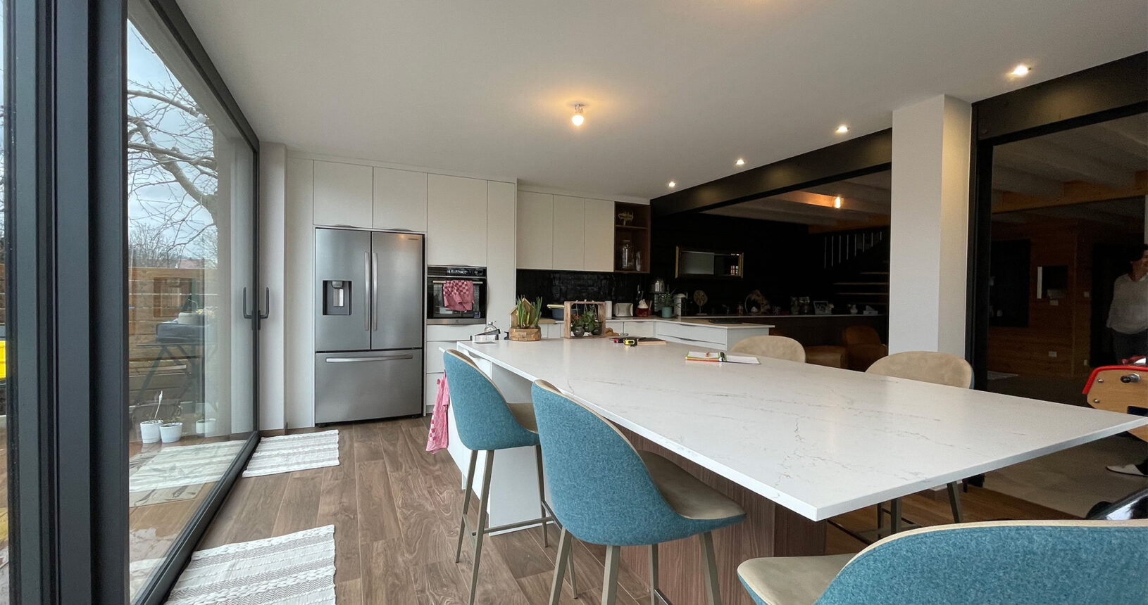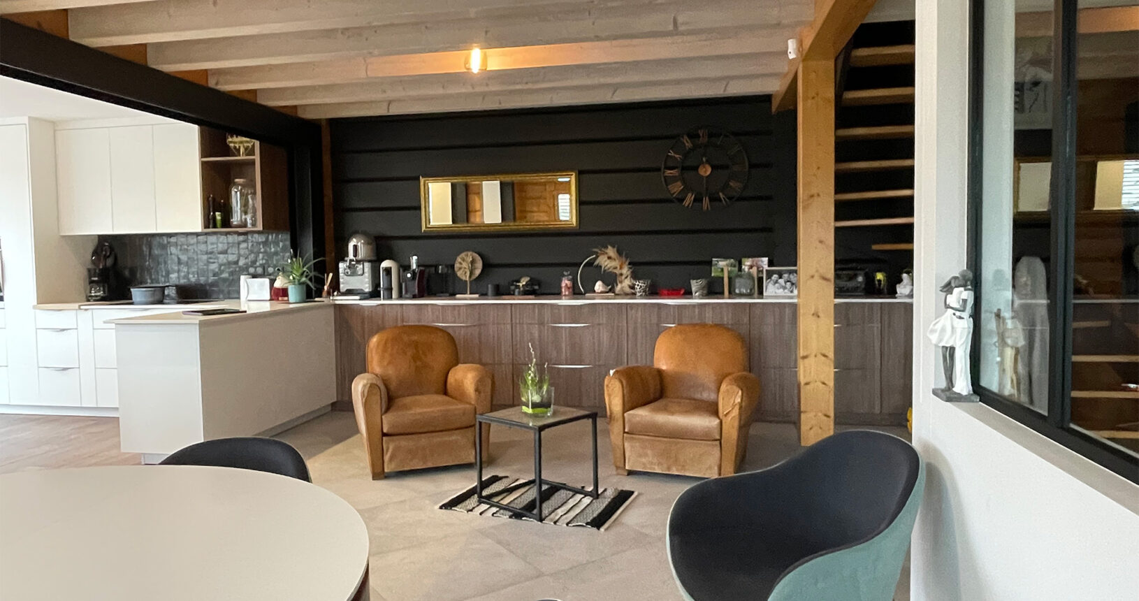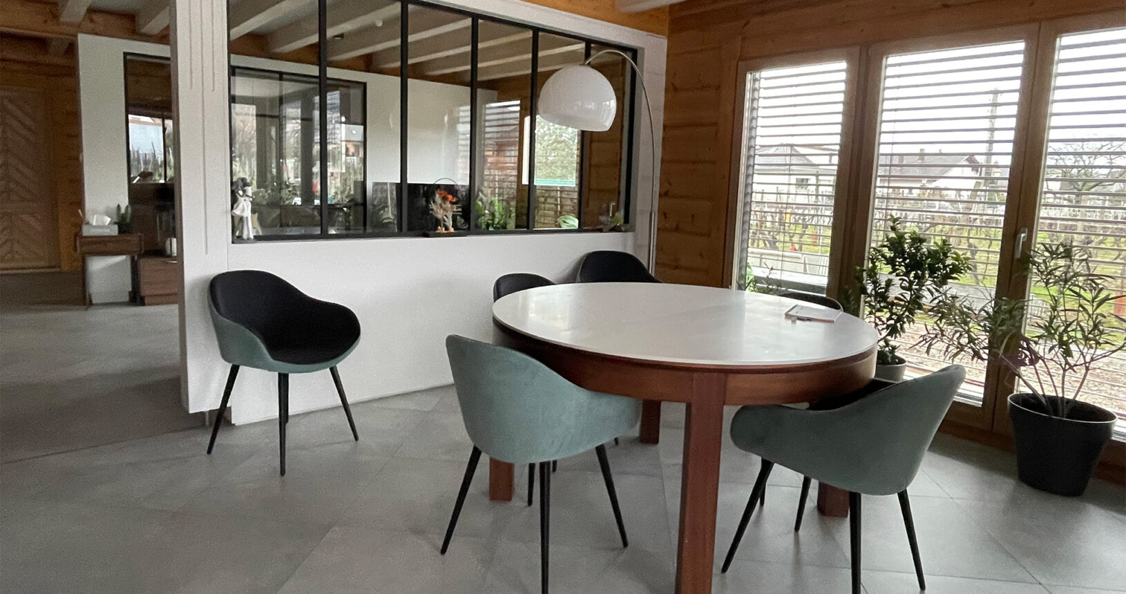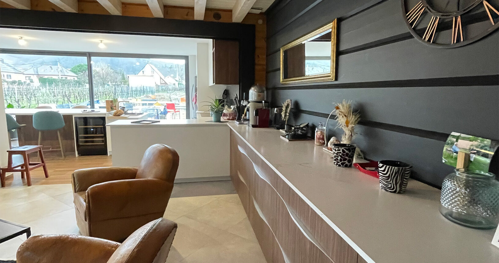 Ainsi, une extension a été créée coté jardin afin d’y installer une généreuse cuisine, baignée de lumière par de grandes baies vitrées offrant une vue panoramique sur le jardin, la piscine, et le château de Kintzheim.